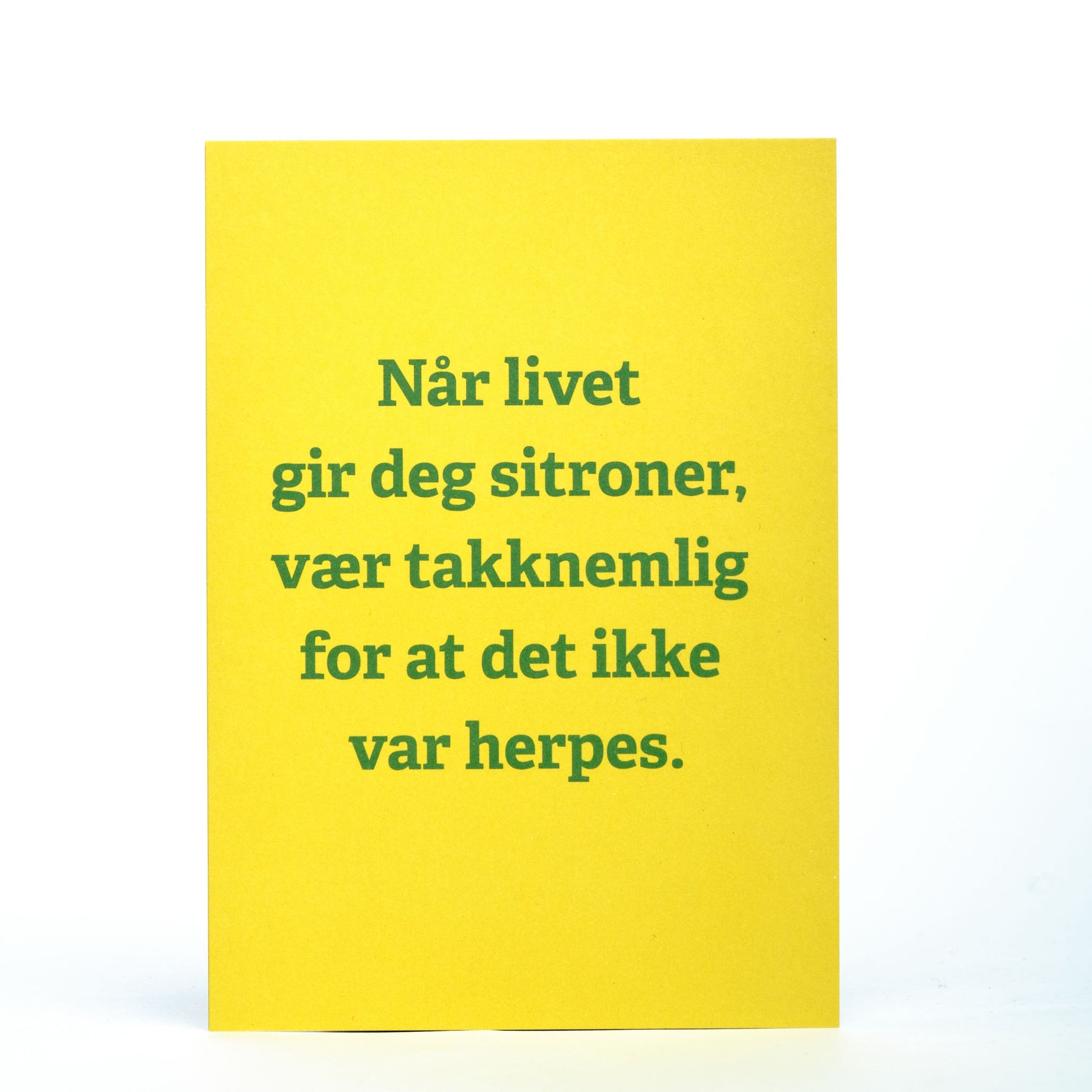 Enkelt kort i størrelse A6 med teksten "Når livet gir deg sitroner, vær takknemlig for at det ikke var herpes.".